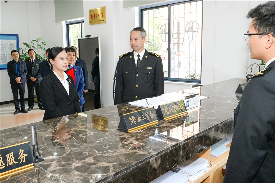 (10月28日下午,市委副书记、代市长韦朝晖在怀化海关、市商务局调研。图为韦朝晖在怀化海关报关窗口详细了解进出口货物通关报关等情况。怀化日报全媒体记者 潘雨 摄)