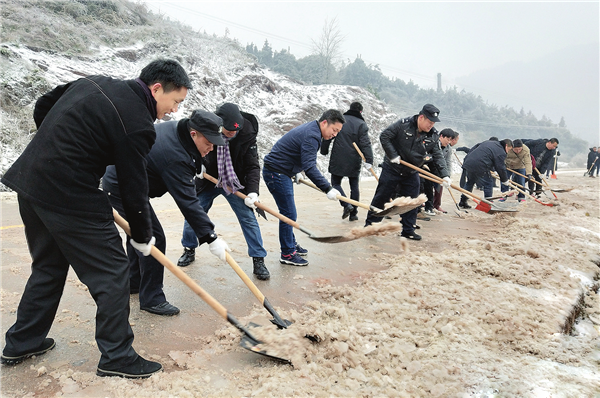 1月27日上午,鹤城区黄金坳镇在职党员干部50余人,来到209国道黄金坳镇仇家村路段对冰冻路面进行铲雪破冰,保障来往车辆及群众安全通行。(本报记者 史琴 通讯员 肖鹏 摄)