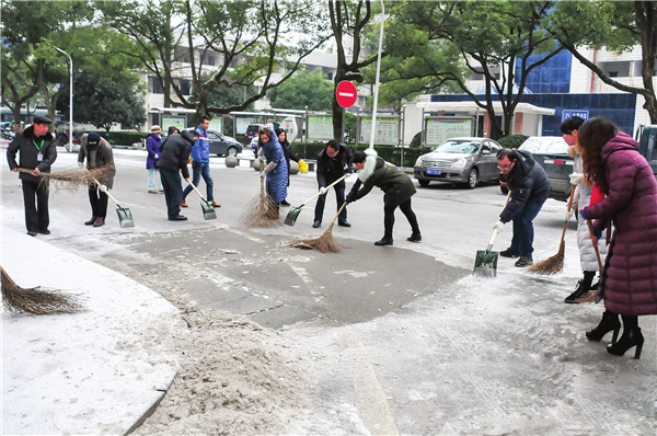 1月26日,市第一人民医院的党员志愿者与医务人员在医院内铲除冰雪,确保行人安全通行。 (曾悦 摄)