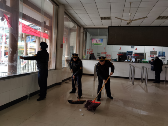 图2 党员志愿者们正在打扫汽车站售票大厅