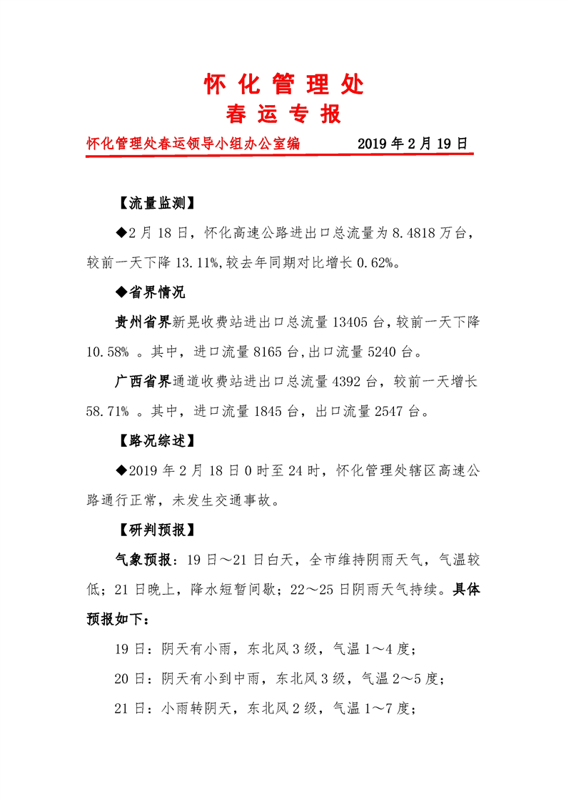 2019年怀化市高速公路春运专报(第28期)