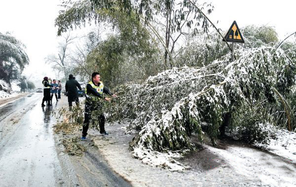 1月16日,受雨雪天气影响,308省道麻阳吕家坪镇塘坊段道路两侧竹木被压弯,侵占道路,影响道路通行。吕家坪镇政府组织相关人员及时清理,确保道路畅通。(胡启球 张青求 摄)