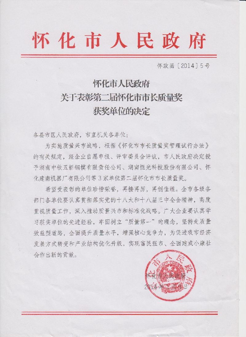 自2011年颁发首届怀化市市长质量奖以来,全市各级各部门,各企业迅速掀起了质量兴市热潮,广泛开展了学习贯彻落实以《卓越绩效评审准则》国家标准和市内外先进企业成功质量管理经验为重点的质量强市活动,我市质量工作得到了很好的发展,为进一步推进质量兴市战略,2013年我市根据《怀化市市长质量奖试行管理办法》的有关规定,经企业自愿申报、评审委员会评议,市人民政府决定,授予湖南中铁五新钢模有限责任公司、湖南恒光科技股份有限公司、怀化建南机器厂有限公司等3家单位第二届怀化市市长质量奖。