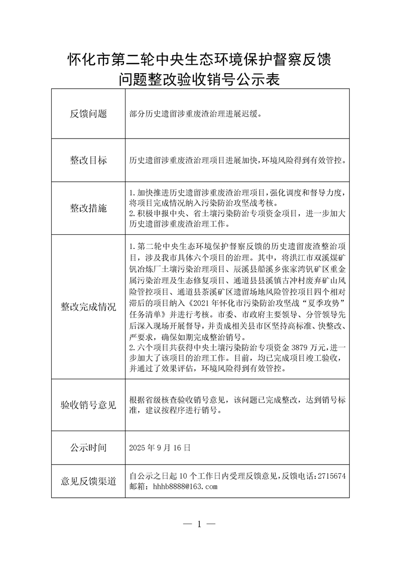 怀化市第二轮中央生态环境保护督察反馈问题整改验收销号公示表