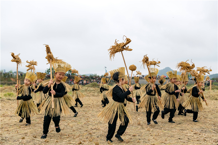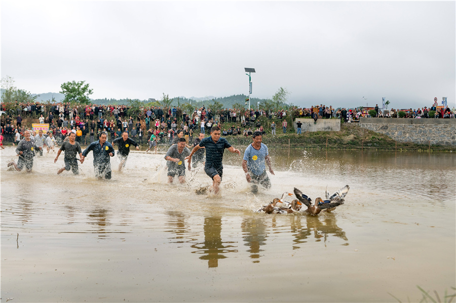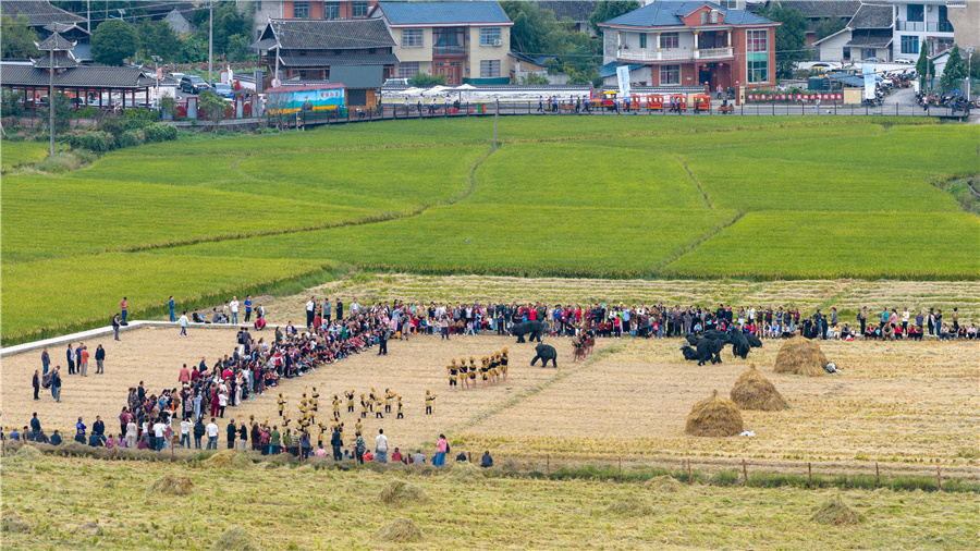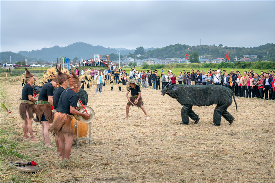 9月23日,中国农民丰收节,会同县的稻香诗田景区内一派欢腾景象,成为庆祝丰收的热闹主场。田埂间稻浪翻滚,空气中弥漫着清甜的稻香,一场场充满乡土气息与欢乐氛围的活动在此轮番上演——激昂的斗牛舞踏着鼓点跃动,金黄的草龙舞在人群中蜿蜒穿梭,拔河比赛的呐喊声此起彼伏,还有趣味十足的抓鸭子游戏,让参与者在追逐与欢笑中共享丰收的喜悦,将秋日的田园变成了一片欢乐的海洋。