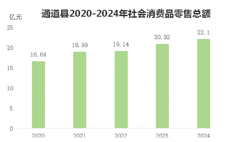 全年社会消费品零售总额22.1亿元,比上年增长5.6%。限额以上法人批发零售企业商品零售额中,粮油、食品类同比增长17.7%,烟酒类同比增长45.8%,日用品类同比增长71.0%,体育、娱乐用品类同比增长40.4%,石油及制品类同比增长4.4%,新能源汽车类同比增长53.3%。