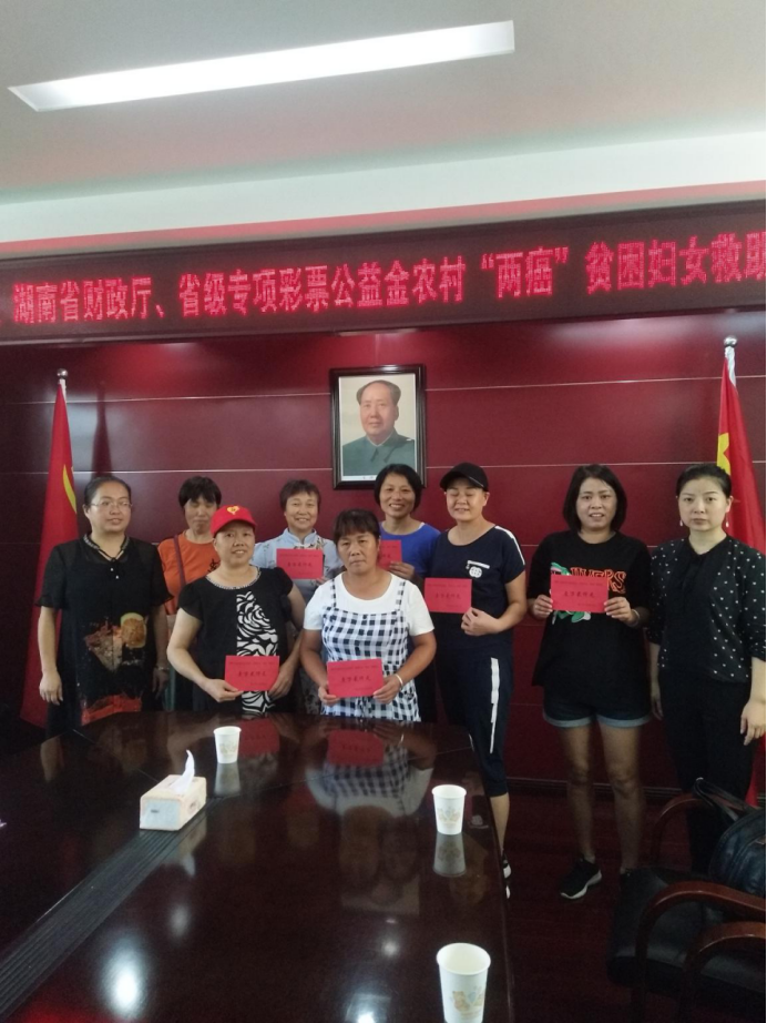 2019年上半年,怀化市共争取到省级专项彩票公益金、农村“两癌”贫困妇女救助金32.4万元,救助全市27名两癌贫困患者,旨在帮助不幸患病的贫困妇女们能充分发扬“自尊、自信、自立、自强”精神,积极乐观面对生活,坚强勇敢对抗病魔,把党和政府的关爱化作战胜疾病的力量,用顽强的意志创造美好灿烂的明天。(图为8月28日,洪江市“两癌”贫困妇女救助金发放现场)
