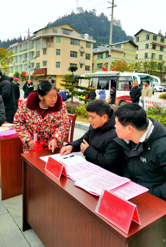 2020年1月13日在会同县漠滨侗族苗族乡三下乡活动现场,工作人员正在为群众解答扶贫政策。