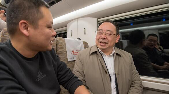 1月11日,省人大代表钟果林在高铁上接受怀化日报记者的采访。(记者 潘雨 摄)