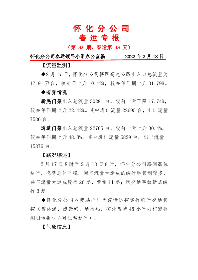 2022年高速怀化分公司第33期春运专报
