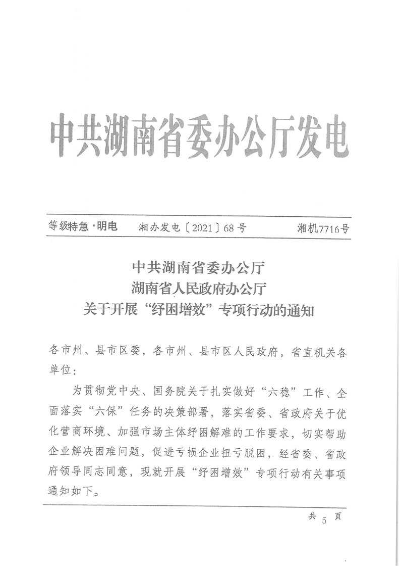 关于开展“纾困增效”专项行动的通知(湘办发电〔2021〕68号)