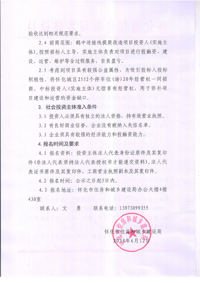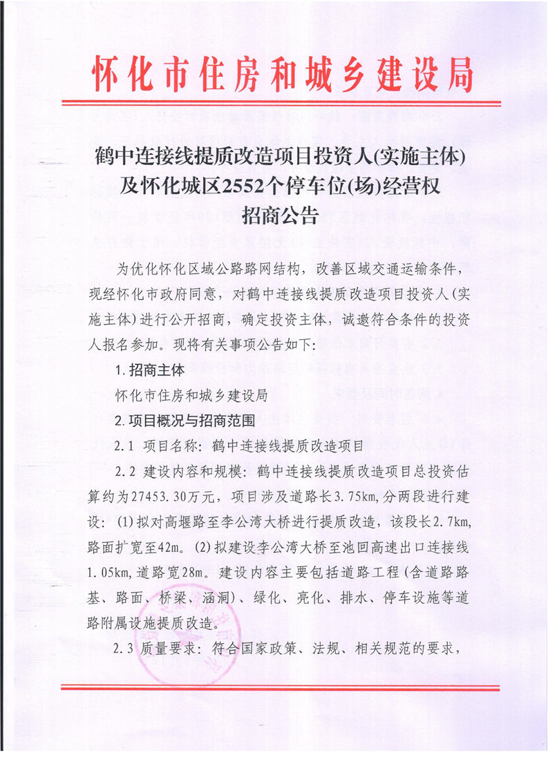 鹤中连接线提质改造项目投资人(实施主体)及怀化城区2552个停车位(场)经营权招商公告