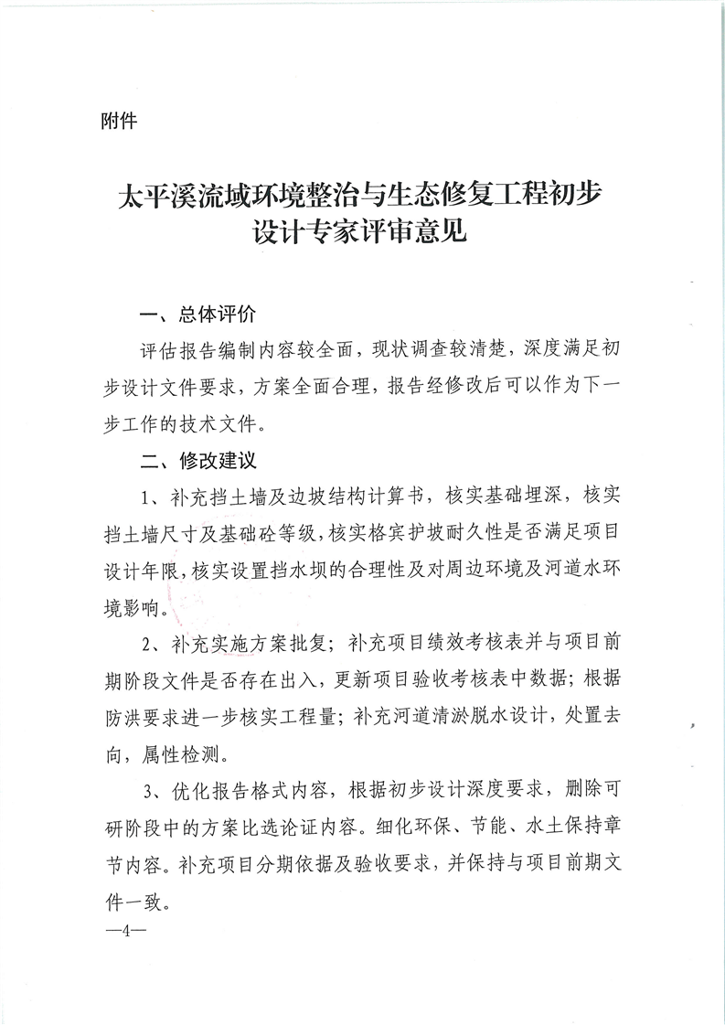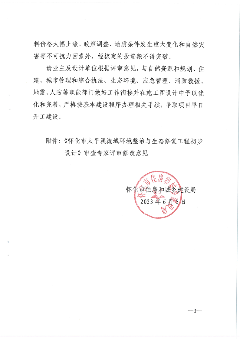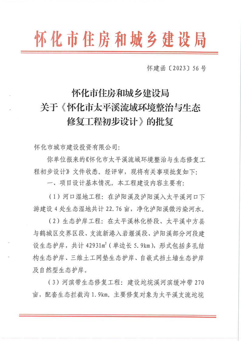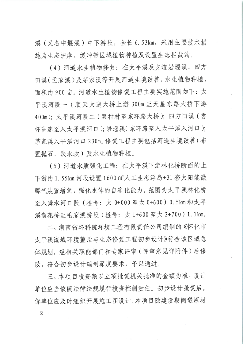 关于《怀化市太平溪流域环境整治与生态修复工程初步设计》的批复