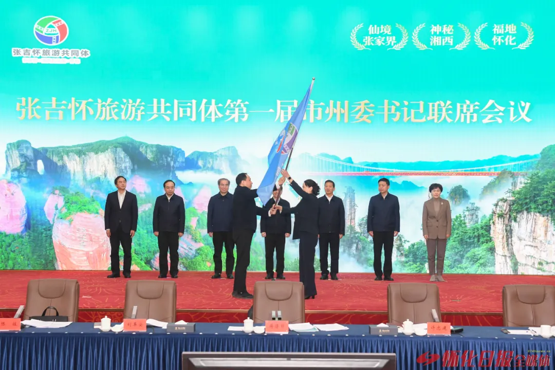 现场,怀化市接过张吉怀旅游共同体会旗,成为新一届轮值主席单位,未来将以张家界、湘西自治州、怀化的顺序每年轮值。