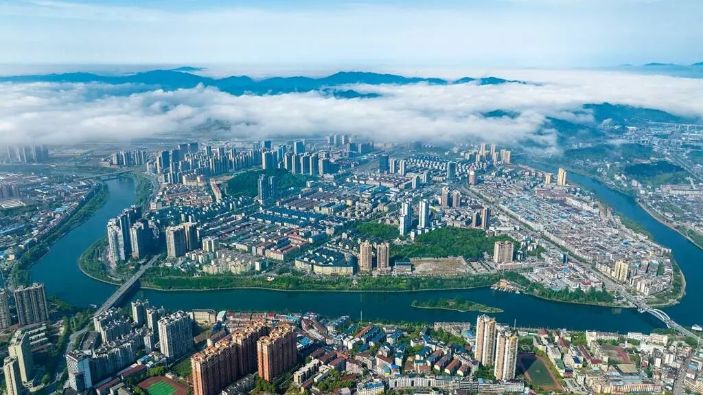 (蓝天白云,碧水绕城,如诗如画。)
