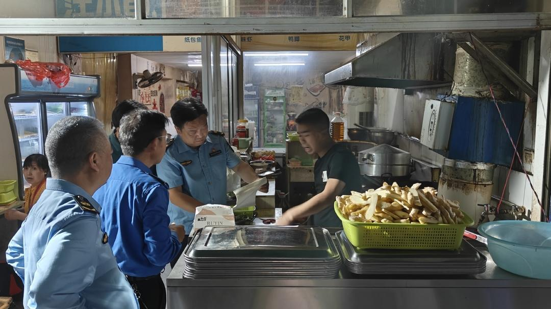 针对舞水家园小区门口左侧的三家夜市烧烤店(杨氏吉首串串、新袁龙虾、新疆喜羊羊烧烤)存在的油烟和噪音扰民问题,联合执法人员采取一看、二闻、三查的方式,首先核查了是否有营业许可证、是否配套建有油烟净化器等情况。经现场检查,三家门店均有营业执照,部分区域安装了隔音、隔油烟门窗,人行道无店外摆桌占道经营现象。随后,联合执法人员要求门店商户要定期清理油烟净化器,确保油烟得到有效处理,按规定开展自行监测,确保餐饮油烟稳定达标排放,不得影响居民生活。