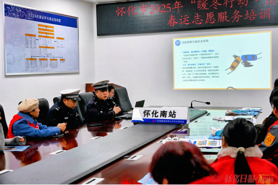 怀化高铁南站副站长陈子佩及值班站长周钰淳就车站的志愿服务岗位设置、服务流程、注意事项等进行了培训;怀化市义工联合会执行会长田军分享了春运志愿服务的经验和技巧;怀化市公安局交警支队直属四大队中队长罗祖超进行了交通安全宣讲,让志愿者们知道了如何在服务过程中向旅客宣传交通安全知识,引导他们安全出行。