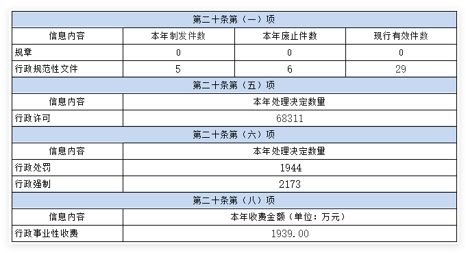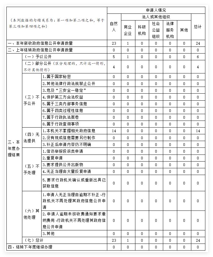 本年度报告根据《中华人民共和国政府信息公开条例》(以下简称《条例》)、湖南省政务公开领导小组办公室《关于贯彻落实(中华人民共和国政府信息公开条例)实施方案》(以下简称《实施方案》)及《怀化市政府信息公开实施细则》(以下简称《细则》)的有关规定,由鹤城区政务公开领导小组办公室编制。全文由总体情况、主动公开政府信息情况、收到和处理政府信息公开申请情况、政府信息公开行政复议行政诉讼情况、存在的主要问题及改进措施、其他需要报告的事项等六部分组成。本报告的统计数据时限为2024年1月1日至12月31日,通过怀化市鹤城区人民政府门户网站对外公布。如对报告有任何疑问、意见,请与怀化市鹤城区政务服务中心联系(地址:怀化市鹤城区政务服务中心五楼501室,邮编:418000,电话:0745-2338221,电子邮箱:hcqzwzx@126.com)。