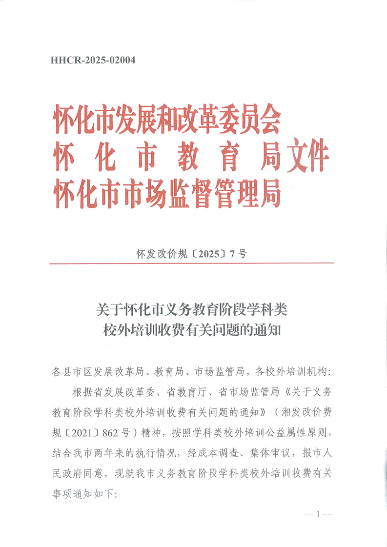 关于怀化市义务教育阶段学科类校外培训收费有关问题的通知
