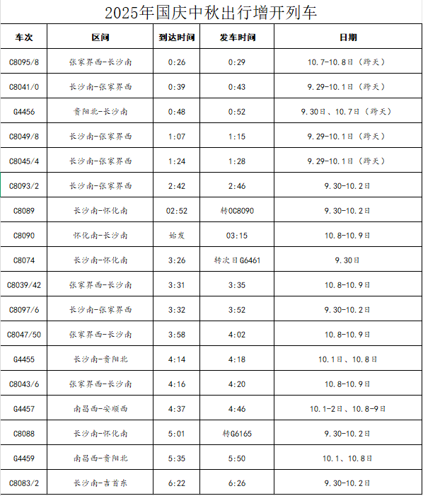 记者从怀化高铁南站获悉,为更好地满足广大旅客的出行需求,怀化高铁南站将加开多趟列车,服务旅客探亲、旅游出行。具体如下: