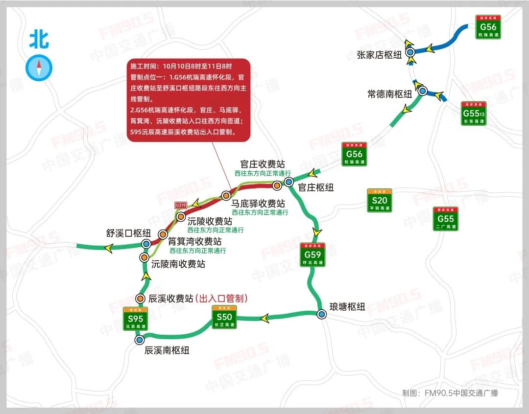 2.G56杭瑞高速怀化段,官庄、马底驿、筲箕湾、沅陵收费站入口往西方向匝道;S95沅辰高速辰溪收费站出入口管制。