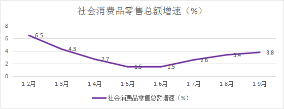 三、商业及服务业保持增长。前三季度,全县社会消费品零售总额同比增长3.8%。按经营单位所在地分,城镇消费品零售额同比增长4.03%,农村消费品零售额同比增长3.09%。基本生活类消费增势较好,限额以上单位粮油食品类,烟酒类商品零售额分别增长30.5%、28.8%。 1-8月,全县规模以上服务业营业收入同比增长11.5%。