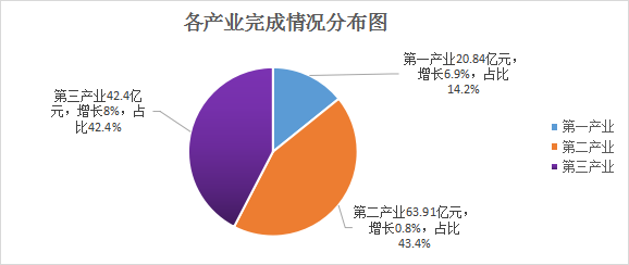初步核算,前三季度全县实现地区生产总值147.22亿元,按不变价格计算,同比增长4.8%。分产业看,第一产业完成增加值20.84亿元,同比增长6.9%;第二产业完成增加值63.91亿元,同比增长0.8%;第三产业完成增加值62.47亿元,同比增长8%。三次产业结构比由去年同期的14.4:44.2:41.4调整为14.2:43.4:42.4。