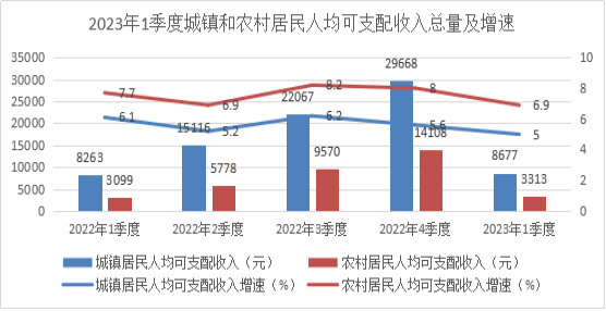 居民收入逐步提高。一季度,全体居民人均可支配收入5231元、同比增长6.4%,其中城镇居民人均可支配收入8677元、同比增长5%,农村居民人均可支配收入3313元、同比增长6.9%。城乡居民人均收入比为2.62,较上年同期缩小0.05。