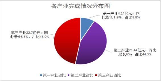 初步核算,一季度全县实现地区生产总值48.39亿元,按不变价格计算,同比增长5.3%。分产业看,第一产业完成增加值4.24亿元,同比增长1.9%;第二产业完成增加值21.44亿元,同比增长5.5%;第三产业完成增加值22.7亿元,同比增长6%。三次产业结构比由去年同期的8.6:46.2:45.2调整为8.8:44.3:46.9。
