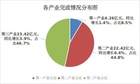 初步核算,一季度全县实现地区生产总值50.1亿元,同比增长4.7%。分产业看,第一产业完成增加值4.26亿元,同比增长1.4%;第二产业完成增加值22.42亿元,同比增长6.4%;第三产业完成增加值23.42亿元,同比增长3.9%。三次产业结构比由去年同期的8.8:44.3:46.9调整为8.5:44.8:46.7。