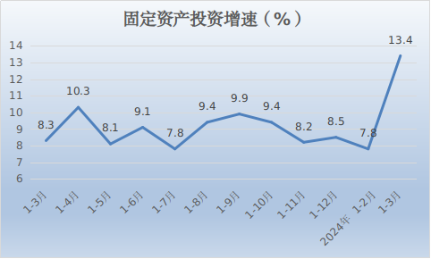 (二)社会有效需求稳步扩大。消费加快增长。1-3月,全县社会消费品零售总额15.67亿元,同比增长5.7%;投资持续回升。1-3月,固定资产投资同比增长13.4%;建筑安装工程投资同比增长11.5%,高于全市0.1个百分点。