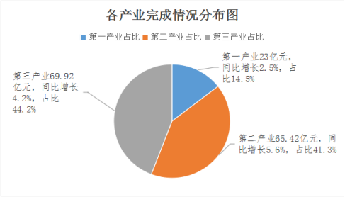 初步核算,前三季度全县实现地区生产总值158.33亿元,同比增长4.6%。分产业看,第一产业完成增加值23亿元,同比增长2.5%;第二产业完成增加值65.42亿元,同比增长5.8%;第三产业完成增加值69.92亿元,同比增长4.2%。三次产业比由去年同期14.2:41.3:44.5调整为14.5:41.3:44.2。