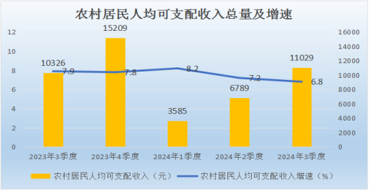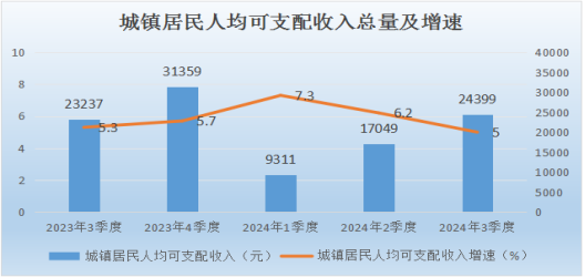 (四)居民收入稳定增长。前三季度实现全体居民人均可支配收入15884元,同比增长6.2%。其中城镇居民人均可支配收入24399,同比增长5%;农村居民人均可支配收入11029元,同比增长6.8%。城乡居民人均收入比为2.21,较上年同期缩小0.04。