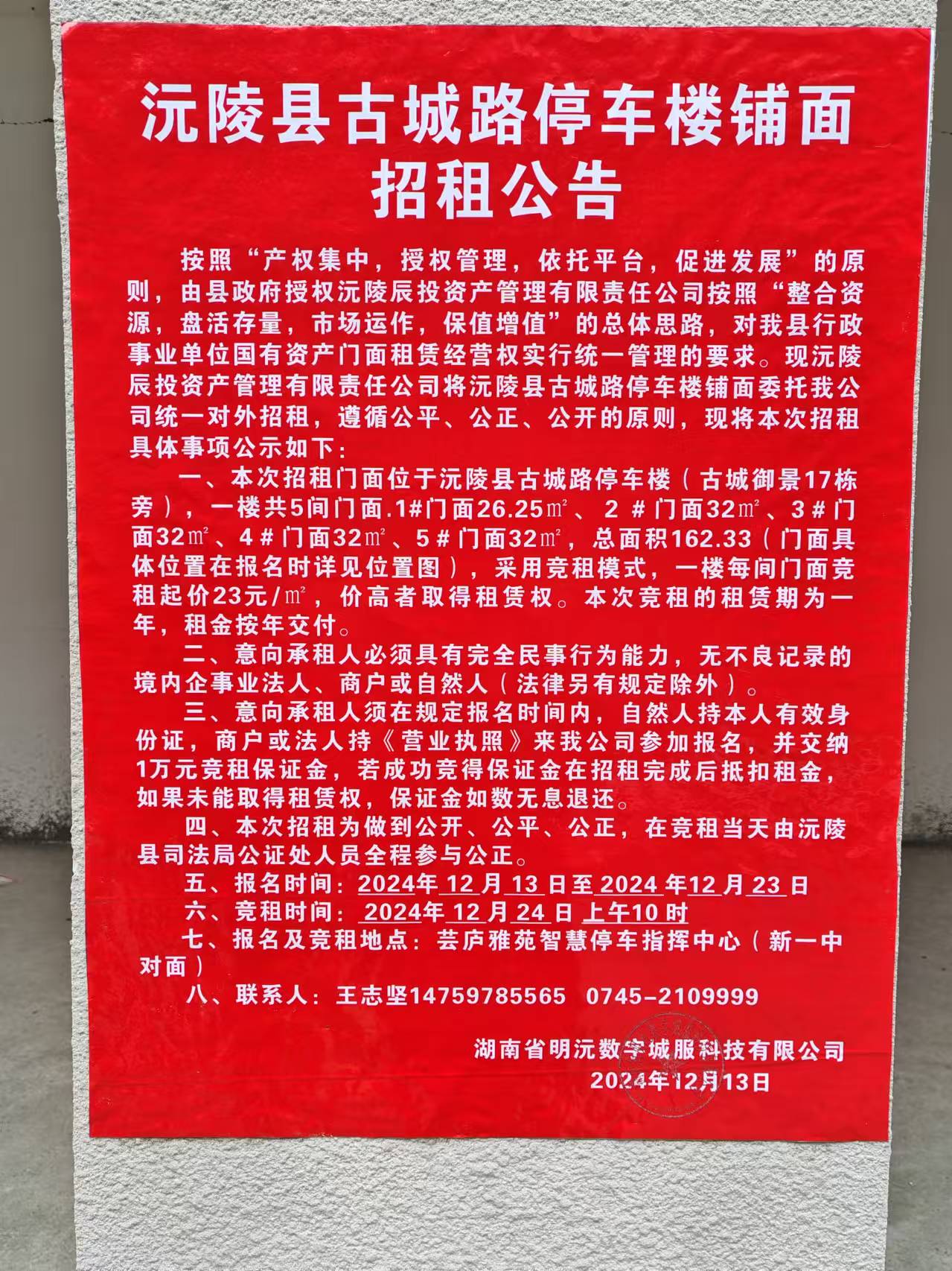 沅陵县古城路停车楼铺面招租公告