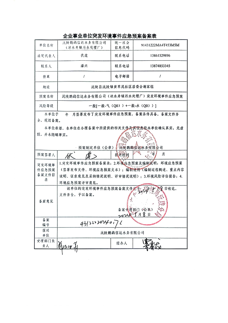 沅陵鹏鹞信达水务有限公司(凉水井镇污水处理厂) 企业事业单位突发环境事件应急预案备案表