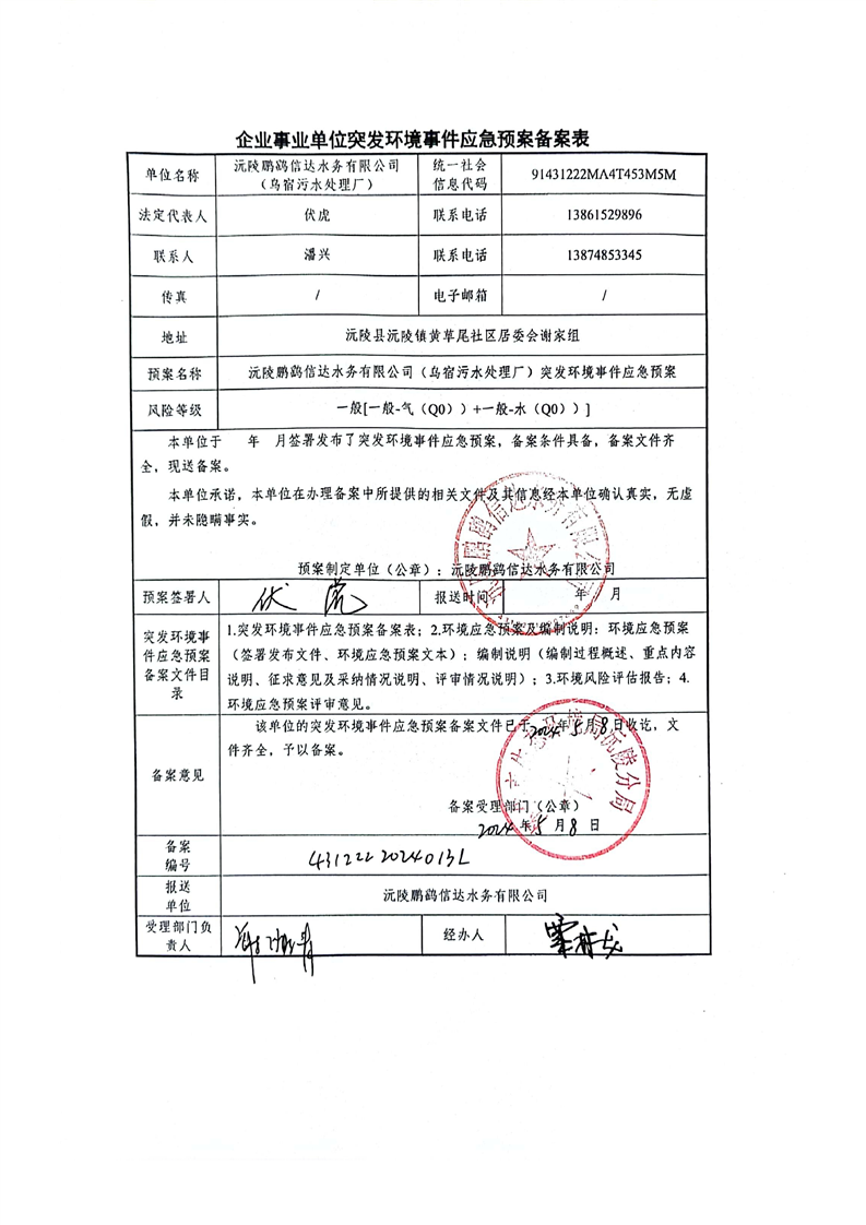 沅陵鹏鹞信达水务有限公司(乌宿污水处理厂) 企业事业单位突发环境事件应急预案备案表