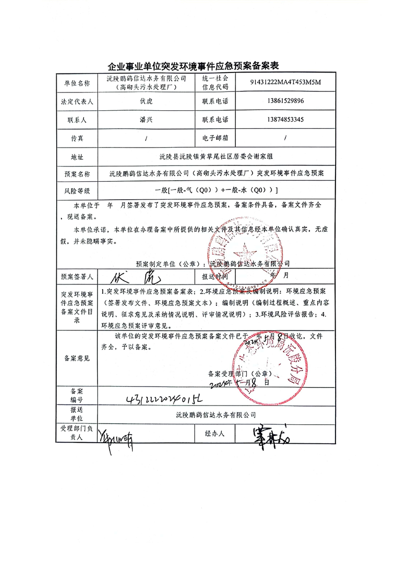 沅陵鹏鹞信达水务有限公司(高砌头污水处理厂) 企业事业单位突发环境事件应急预案备案表