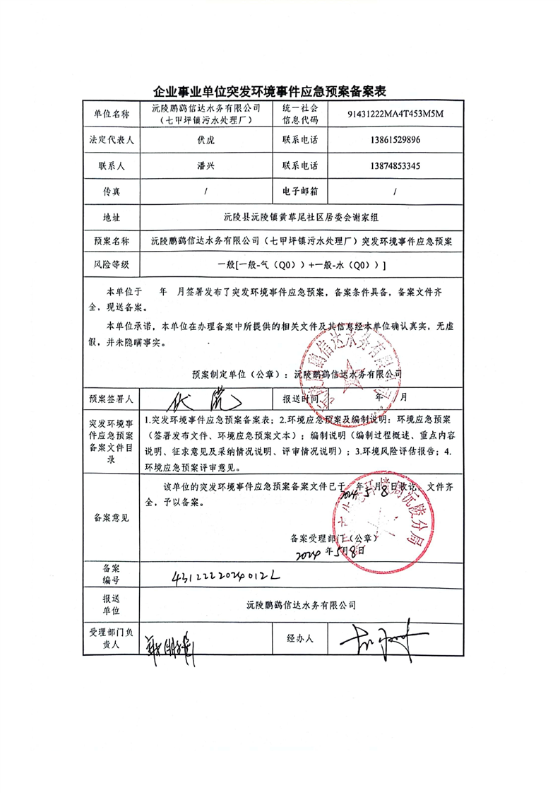 沅陵鹏鹞信达水务有限公司(七甲坪镇污水处理厂) 企业事业单位突发环境事件应急预案备案表