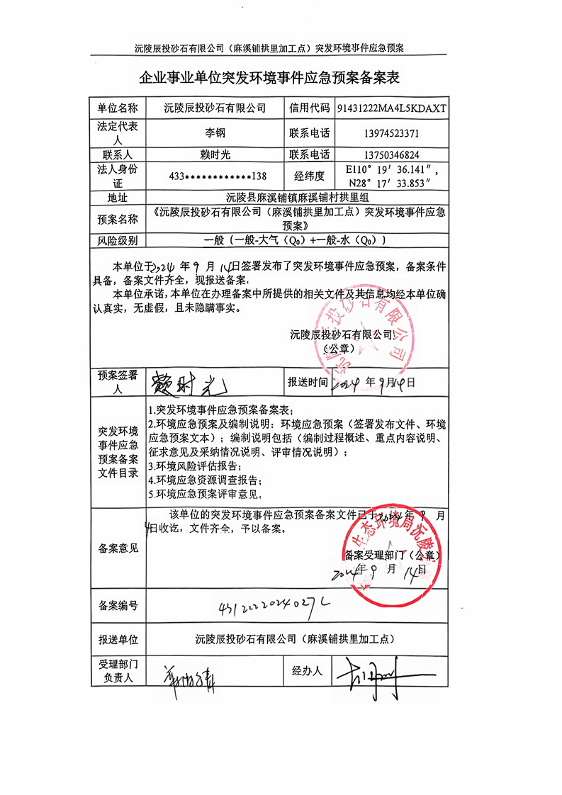 沅陵辰投砂石有限公司(麻溪铺拱里加工点) 企业事业单位突发环境事件应急预案备案表