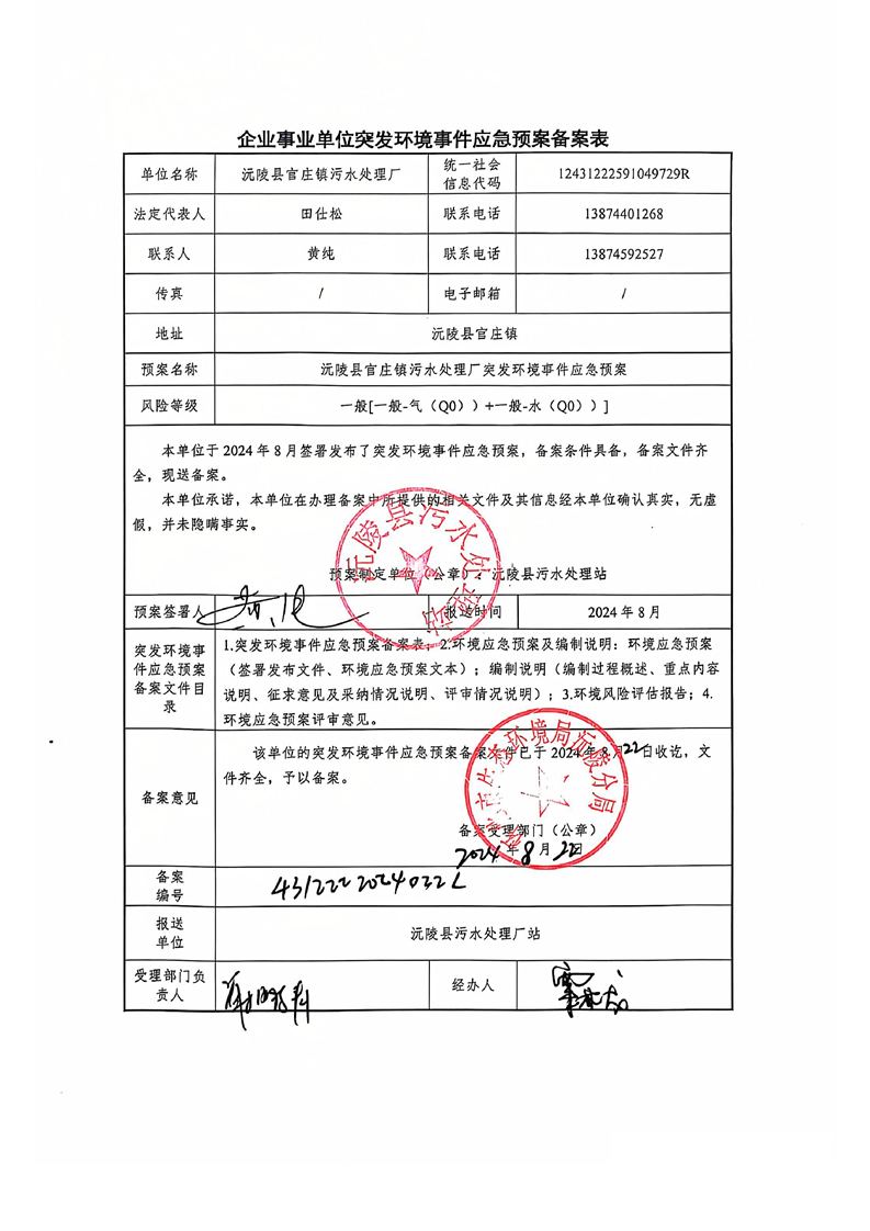 沅陵县官庄镇污水处理厂 企业事业单位突发环境事件应急预案备案表