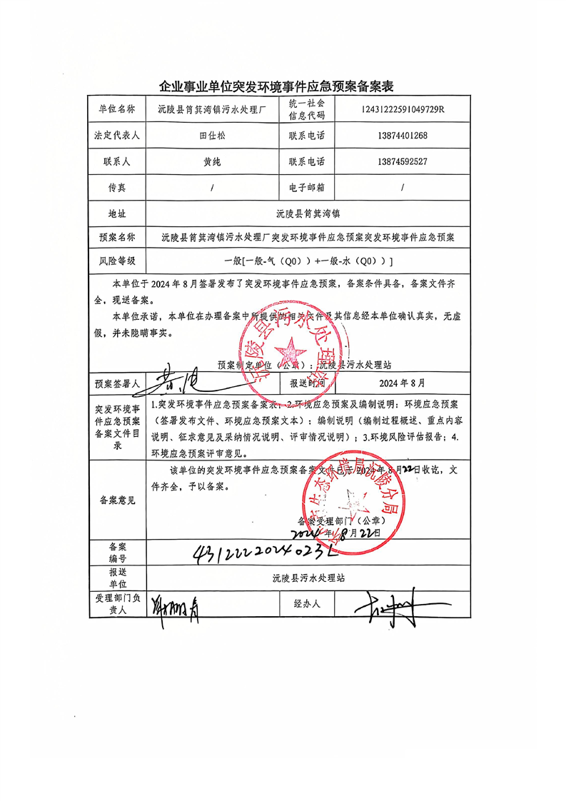 沅陵县筲箕湾镇污水处理厂 企业事业单位突发环境事件应急预案备案表