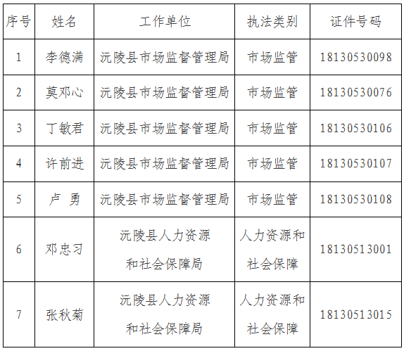 李德满等7名同志所持《中华人民共和国行政执法证》遗失,根据《湖南省行政执法人员和行政执法辅助人员管理办法》第十条第二款之规定,对其《中华人民共和国行政执法证》公告作废。