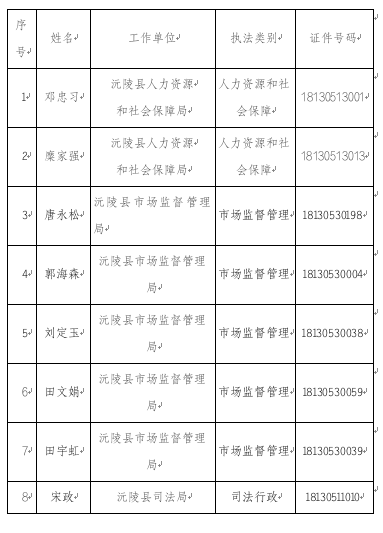 邓忠习等8名同志因岗位调整,不再从事行政执法工作,根据《湖南省行政执法人员和行政执法辅助人员管理办法》第十条第三款之规定,对其《中华人民共和国行政执法证》公告注销。