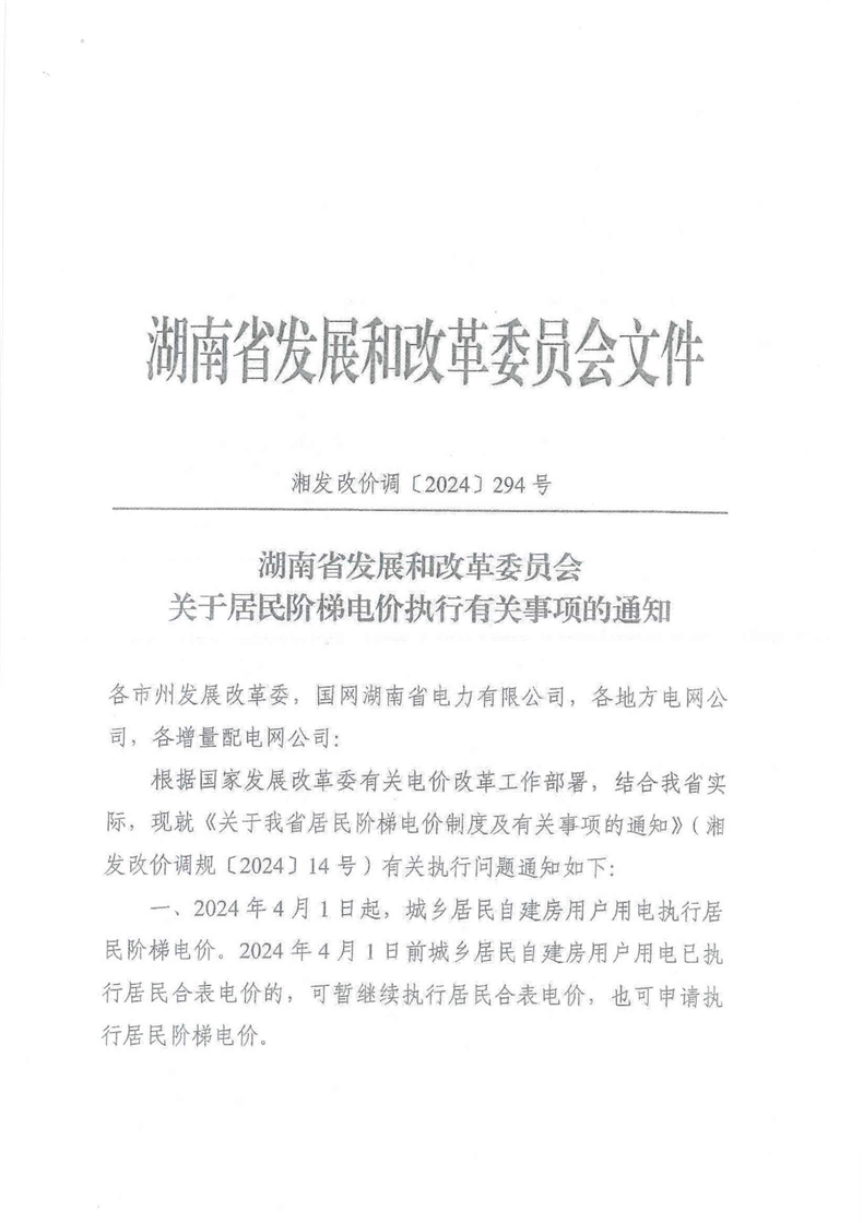湖南省发展和改革委员会关于居民阶梯电价执行有关事项的通知