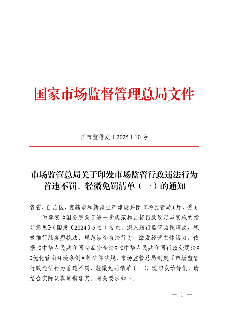 市场监管总局关于印发市场监管行政违法行为首违不罚、轻微免罚清单(一)