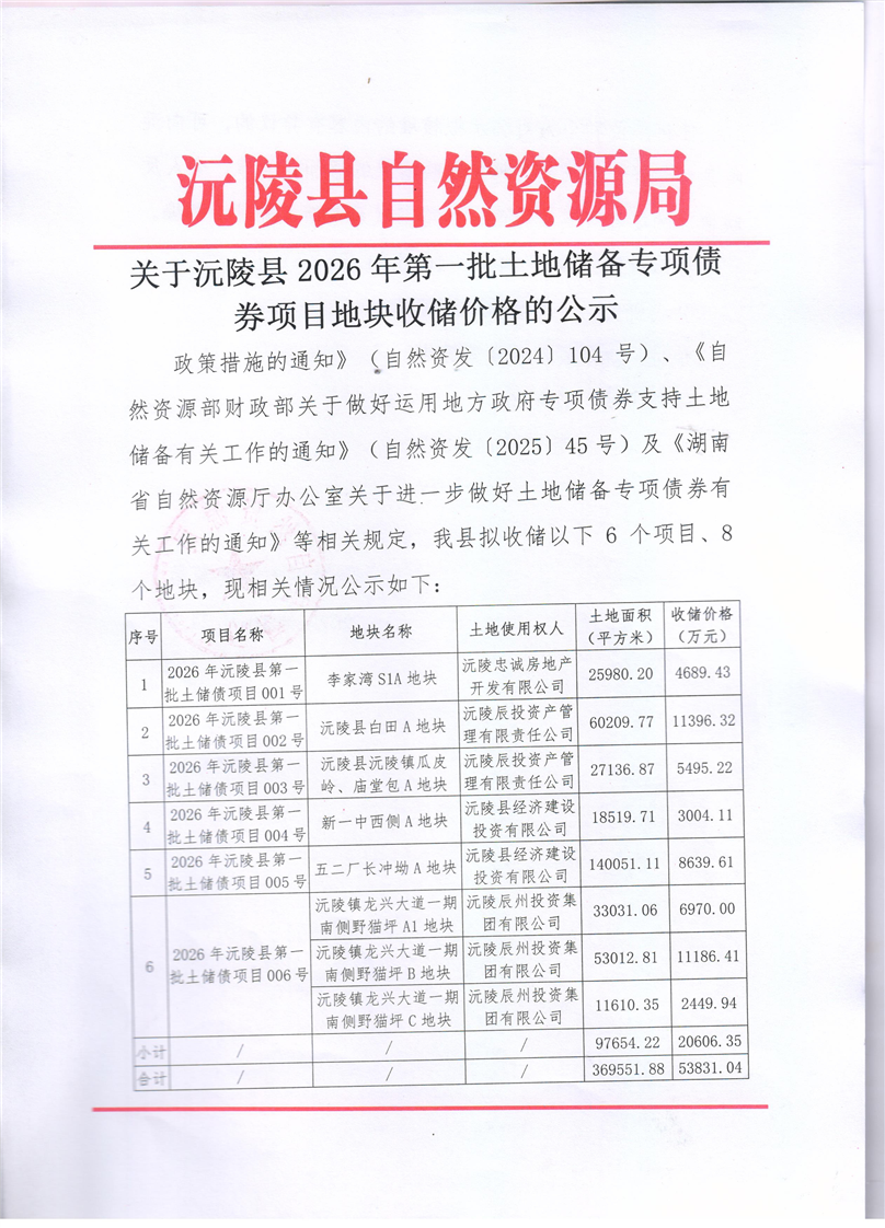 关于沅陵县2026年第一批次土地储备专项债券项目地块收储价格的公示