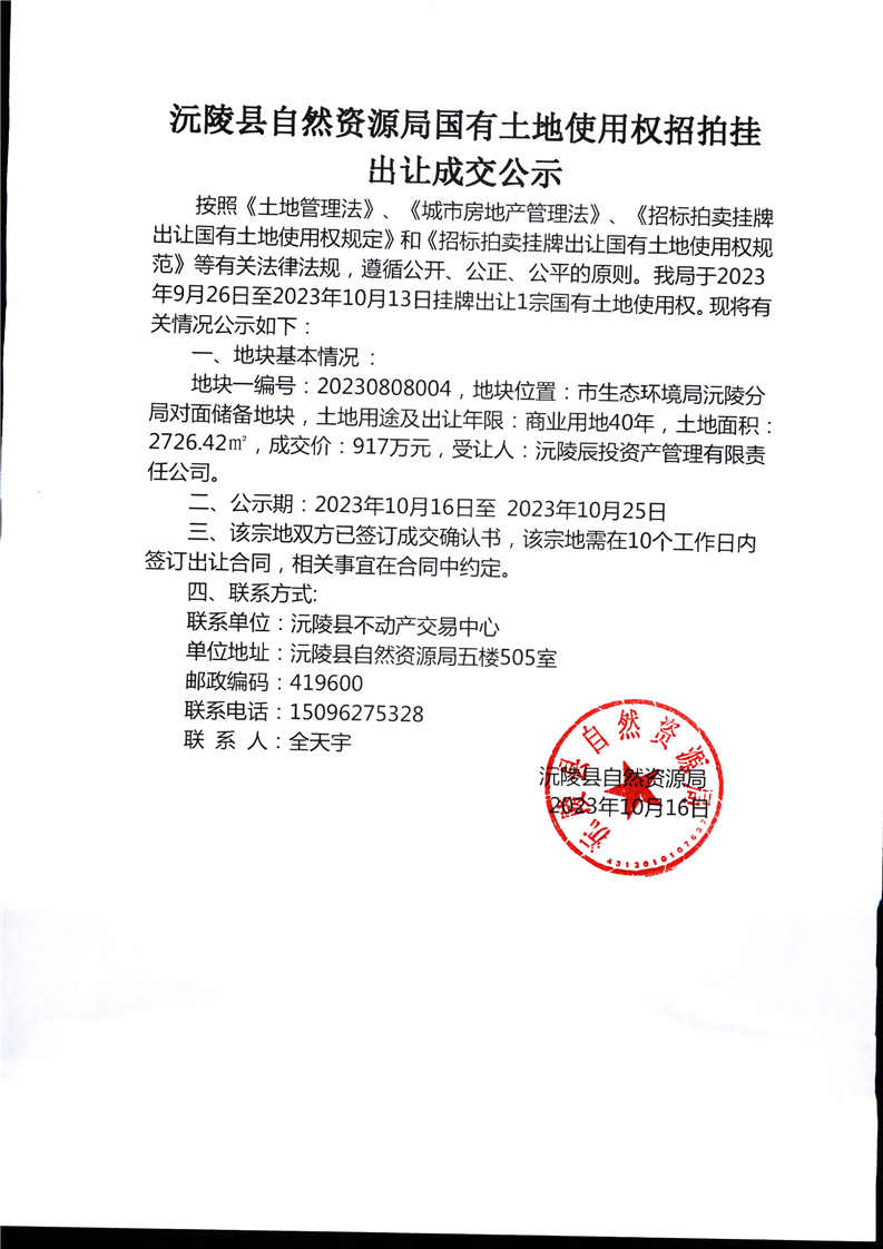 沅陵县自然资源局国有土地使用权招拍挂出让成交公示(市生环局沅陵分局对面储备地块)