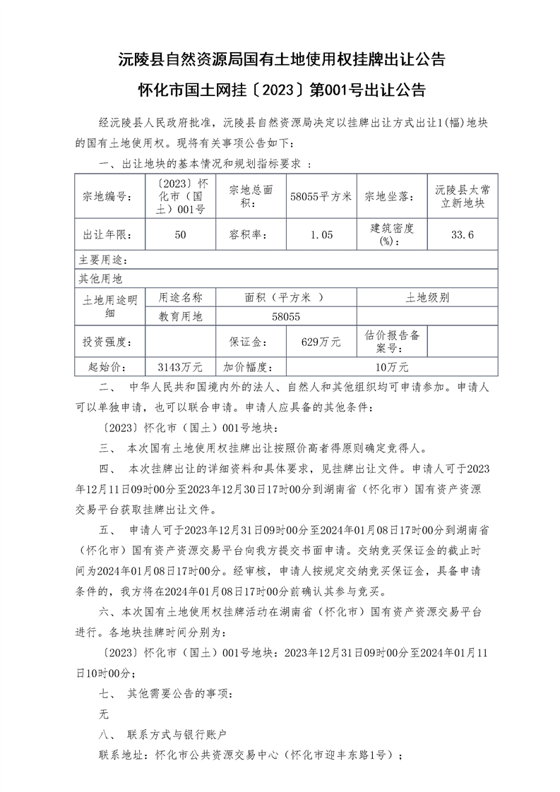 沅陵县自然资源局国有土地使用权挂牌出让公告