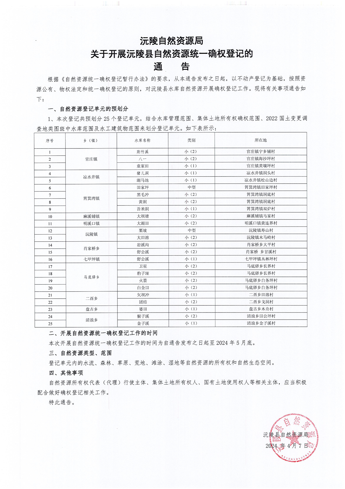 沅陵县自然资源局关于开展沅陵县自然资源统一确权登记的通告