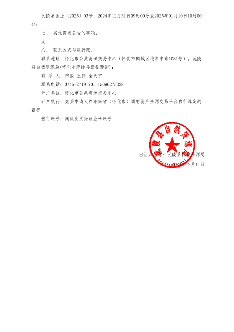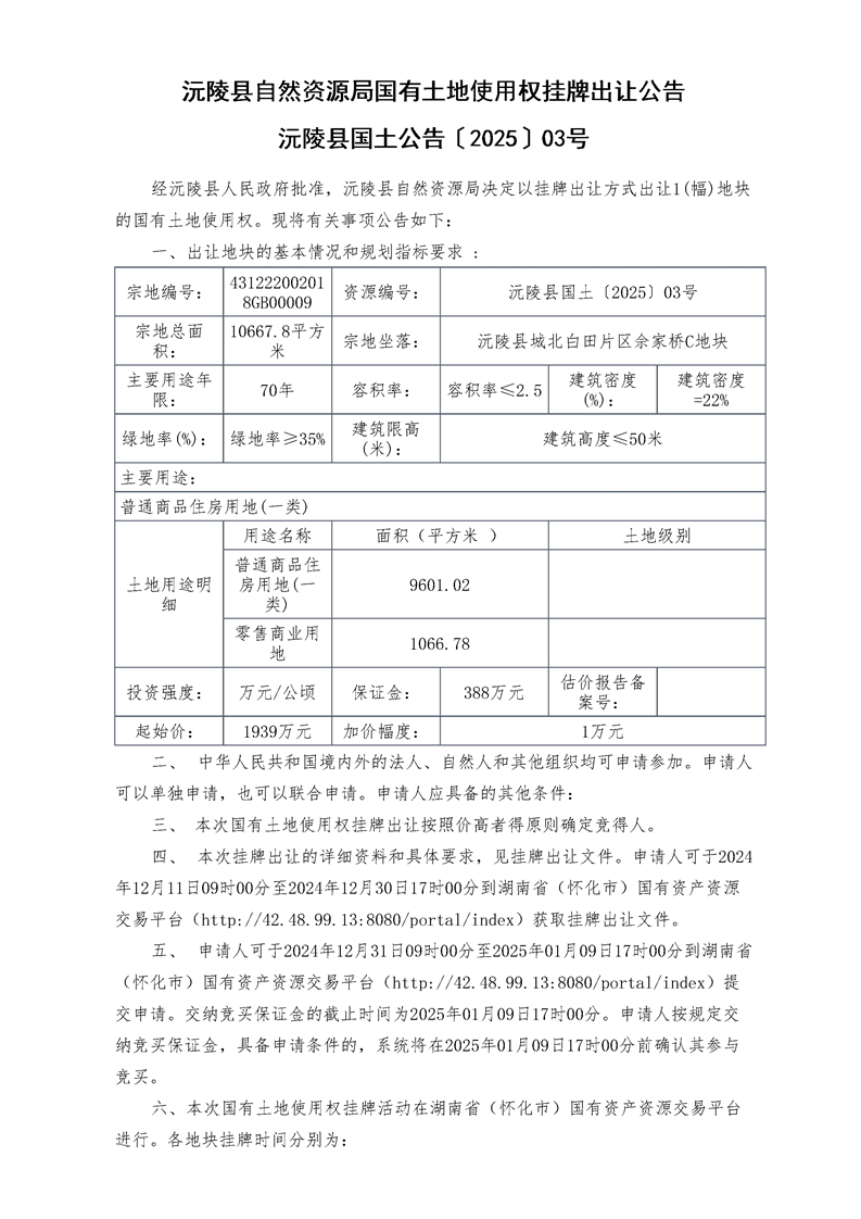 沅陵县自然资源局国有土地使用权挂牌出让公告